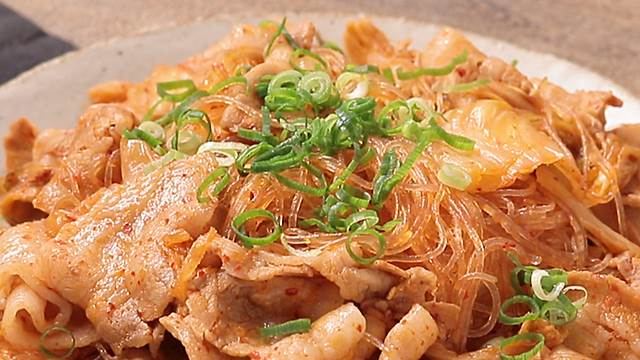 春雨を加えたら、全体が浸るように軽く押さえ、弱めの中火で加熱する。途中で混ぜながら、春雨が透明になって柔らかくなるまで煮絡める。水分が多い場合は少し飛ばし、味を見て足りなければ塩こしょうなどで調整する。