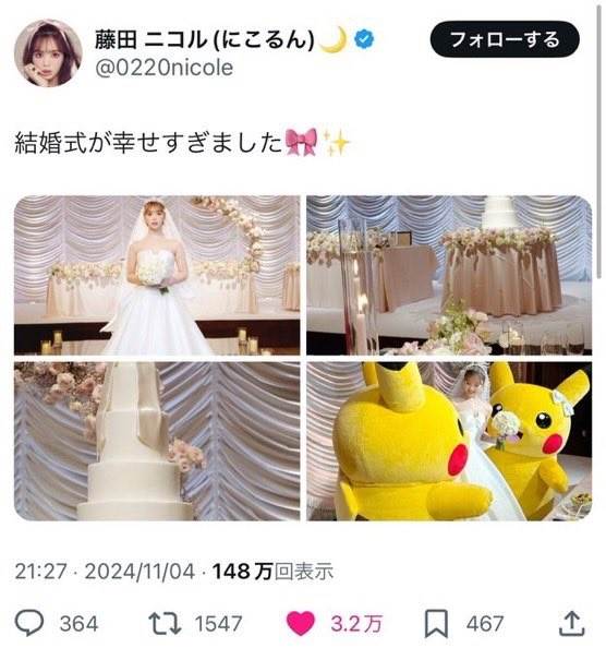藤田ニコルのX(旧Twitter)に投稿された写真には、“豪華すぎる結婚式”とともに、こんな一言が添えられていた。